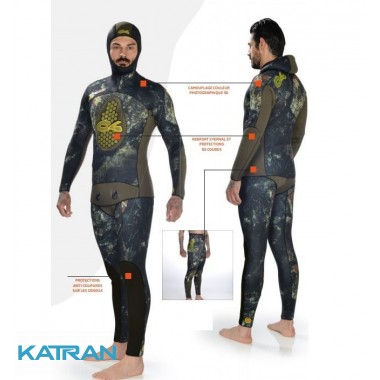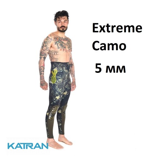 Нове слово в розробці і створенні товарів для підводного плавання - гідрокостюм Extreme Camo. Для виготовлення моделі використаний неопреновий каучук - матеріал, що поєднує в собі величезну кількість переваг. Неопреновий каучук сертифікований TUV на відсутність хімічних речовин, які можуть завдати шкоди навколишньому середовищу або здоров'ю людини, таких як фталати і латекс. Він також відрізняється високою стійкістю до стискання і відмінною відновлюваністю. Крій моделі детально продуманий з урахуванням особливостей анатомії чоловічої фігури: еластичність і піддатливість матеріалу дозволили максимально зменшити число швів, що помітно позначається на зручності у використанні і комфорт власника. Куртка і штани забезпечені міцними елементами додаткового захисту: на грудях і ліктях (куртка), на колінах (штани).