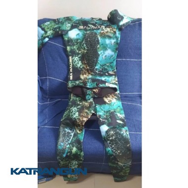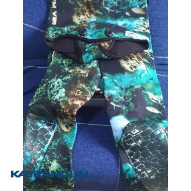 Гідрокостюм для підводного полювання Salvimar Seawalker 5.5 мм складається з двох частин, штанів з високою талією без лямок і куртки з капюшоном і бобровим хвостом на двох кліпсах. Зсередини неопрен з відкритою порою, зовні камуфльований super stretch лайкра. На ліктях і колінах є посилені вставки з гуми PUFFGUM. Зручна і практична носка. Зовнішня обробка швами з подвійноъ нейлонової нитки для максимальної міцності гідрокостюма. Застібка з подвійною пряжкою в нижній частині куртки. Дуже зручний і міцний гідрокостюм.
