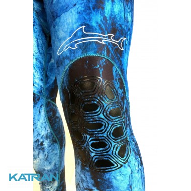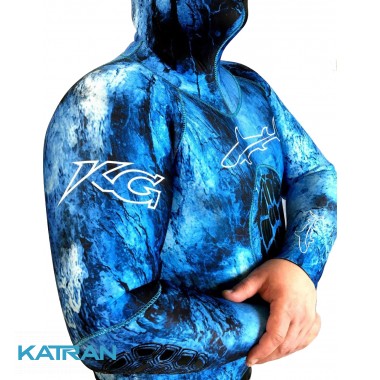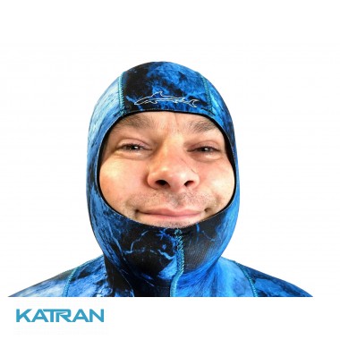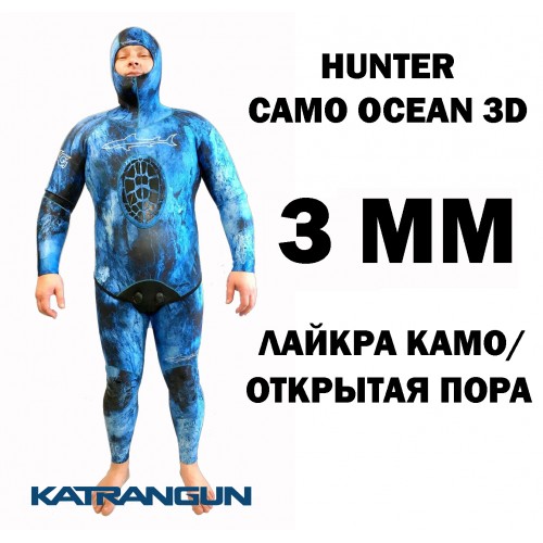 Гідрокостюм KatranGun Hunter Camo Ocean 3D складається з двох частин — куртки з шоломом і штанів без лямок (штани з високою талією). Куртка має внизу бобровий хвіст з двома кліпсами, що забезпечує зручне і надійне застібання. На грудях — хороший упор для зарядки рушниць, виконаний у формі панцира черепахи, запатентований фірмою KatranGun. Передбачені наколінники і налокітники, зі спеціальним напиленням, так само у формі черепашачого панцира. Шолом має найменший отвір під маску тому якщо ви будете використовувати не малооб'ємне, а маску з великою оглядовістю, у вас є можливість підрізати шолом саме під вашу маску.