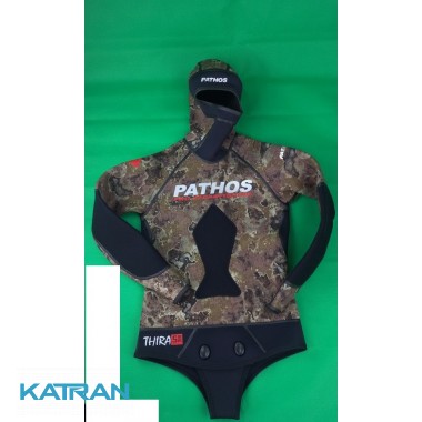 Гідрокостюм Pathos Thira виготовлений з супер еластичного неопрена Sheico високої щільності, з ідеальним камуфляжним малюнком для того, щоб бути максимум не помітні під водою і на дні. Гідрокостюм розроблений для забезпечення максимального комфорту, тепла і довговічності. Для цього передбачені неопренові вставки, покриті супереластичними чорної підкладкою з обох сторін грудної клітини, безпосередньо під пахвами і на передній частині шиї, від основи до підборіддя. Це дозволяє легко дихати і полегшує руху шиї, де зазвичай складається неопрен. Всі шви покриті неопреновим герметиком, який має подвійне перевага: забезпечує герметизацію шва, уникаючи звичайної усадки і підвищуючи захист від води. Також на зап'ястях і щиколотках, на контурі особи є обтюрация для мінімізації попадання води. Більш тонкий матеріал і відсутність швів створюють відчуття комфорту і гарантують водонепроникність.