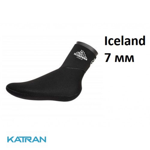 Шкарпетки «сухого» типу SCORPENA Iceland змодельовані за формою ноги при роботі ластами, тобто в порівнянні з класичними носками вони мають більш витягнуту форму. Це зменшує навантаження на м'язи і продовжує час комфортного плавання. Така конструкція шкарпеток разом з анатомічно різними викрійками для правої і лівої ноги значно полегшує їх надягання, також вони краще сідають на стопу. Шкарпетки оснащені подвійною манжетою з внутрішнім покриттям типу smoothskin, що в поєднанні з манжетами штанин мисливського гідрокостюма практично повністю запобігають потраплянню води всередину. Шкарпетки виготовлені з декількох марок неопрена фірми SHEICO, склеєні новітнім неопреновим клеєм на водній основі (без хімічного розчинника). Шкарпетки зшиті «сліпим» швом (голка не пробиває неопрен наскрізь, а тільки зшиває зовнішню тканину), що перешкоджає проникненню води через шви. Зовнішнє і внутрішнє покриття шкарпеток - нейлон. Для підошви шкарпеток Scorpena Iceland використаний більш щільний неопрен з високою стійкістю до стаптиванію при ходьбі. Зсередини ця підошва покрита матеріалом типу «плюш» для запобігання прослизання при ходьбі по похилих ділянках, а зовні - матеріалом типу supratex, для зменшення стирання. Товщина шкарпеток - 7 мм. Розміри від 36-37 (XS) до 46-47 (XXL).