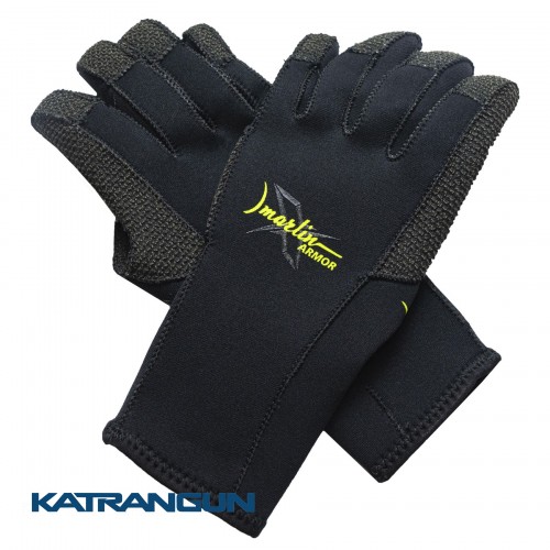 Рукавички Marlin Armor 3 мм (Марлін Армор) виготовлені з еластичного неопрену, з нейлоновим покриттям всередині та зовні. Долоні та пальці рукавичок захищені кевларом. Унікальна міцність кевлара, дозволяє використовувати рукавички любителям рек-дайвінгу, підводним археологам, промисловим водолазам, промисловцям і просто любителям лову раків. Анатомічний крій забезпечує зручність при одяганні та використанні. При виробництві цієї моделі рукавичок використовуються екологічний неопрен та тканинні матеріали провідного світового виробника - Sheico (Шейко).