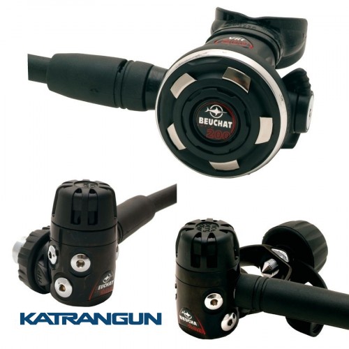 Регулятор VR 200 задає новий стандарт якості для компактних мембранних регуляторів класу «преміум». Збалансований мембранний перший ступінь для забезпечення найбільшої надійності і безпеки.Його продуктивність здатна у повній мірі забезпечити піддув компенсатора плавучості, піддув сухого костюма і піддув буйка. На значенні 70 bar установче тиск збільшується на 10 bar, що збільшує потік повітря в другий щабель, не дивлячись на падіння значення високого тиску. Також перший ступінь обладнана системою проти зледеніння (патент Beuchat). 4 порти низького тиску і 2 високого мають ергономічне розташування. Новий анатомічний загубник з великим клапаном видиху запобігає вібрації при видиху. Дефлектор придбав новий оптимізований дизайн для відводу пухирців з поля зору.