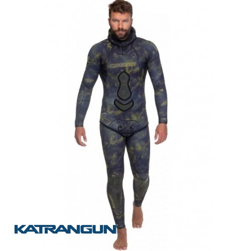 Гідрокостюм для полювання/фрідайвінгу від Cressi. Камуфляж базований на реальному зображенні риби (в даному випадку риби-дельфіна з її домінуючими кольорами). Якісний преформований анатомічний крій. Костюм складається з коротких штанів з високою талією та куртки із шоломом. М'який неопрен, ззовні високоеластичний камуфляж, усередині відкрита пора. На грудях упор для заряджання арбалета. На кісточках, зап'ястях та на шоломі навколо обличчя ватерстопи. Захисні накладки на колінах та гомілках.