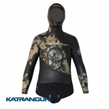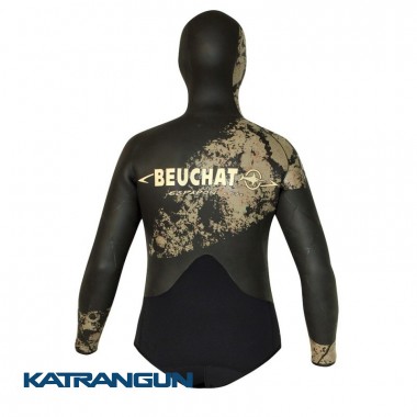 Гидрокостюм Beuchat Espadon Elite 7 мм премиум класса создан для опытных подводных охотников, которым требуется гладкий костюм для эффективной и интенсивной охоты на глубине. Внутренняя сторона костюма классическая голая пора, она обеспечивает максимальной термозащитой, снаружи – гладкий неопрен. Гладкая внешняя сторона костюма быстро высыхает на ветру и не охлаждается, что особенно важно в конце любых погружений, а также для ныряющих с лодки. Куртка костюма имеет встроенный капюшон, штаны без лямок. Эксклюзивная раскраска X-Ray Camo создана на основе камуфляжа Beuchat Trigocamo, переработанного под гладкое покрытие костюма. Лекала костюма разработаны с учётом анатомических изгибов спины и ягодиц. Правильный крой уменьшает образование складок и натяжения материала в седле штанов. Специальная вытачка на пояснице предотвращает образование водных пустот в области спины и между плечами. Бесшовные эластичные вставки на плечах, под коленями и в локтях снижают трение костюма о кожу. Промежность штанов и нижняя часть куртки, со вставками из эластичной ткани для уменьшения износа костюма в зонах повышенного трения. Естественные монохромные цвета позволяют охотнику слиться с окружающим пейзажем. Камуфляж размещен в основном на передней поверхности костюма и разделен на несколько различных зон, разбивая силуэт и делая его ещё менее заметным. Куртка костюма оснащена накладкой на груди, не создающей дополнительного сопротивления в воде и улучшающей сцепление для упора ружья при заряжании.
