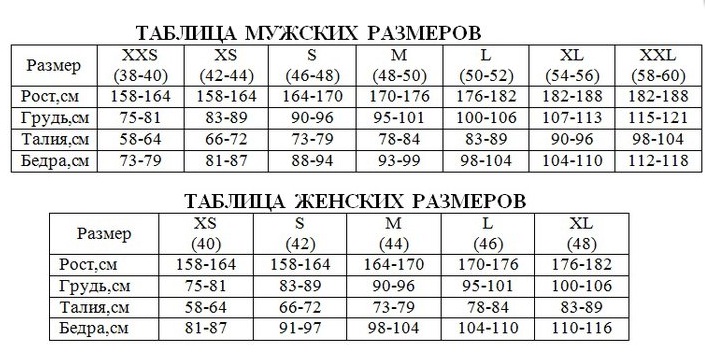 Размерные таблицы маек и шорт для подводной охоты