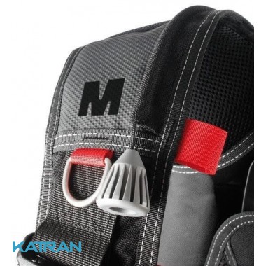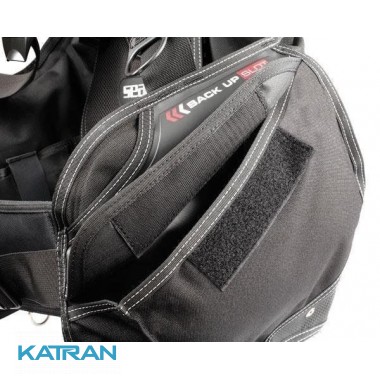 Помимо сплава, спинка имеет сложный эргономичный штампованный профиль, придающий ей прочность и устойчивость к деформации. Основным преимуществом этой металлической спинки является легкий вес, она не меняет плавучести при погружении и веса при намокании, в отличии от ее тряпочных аналогов. На внутренней стороне спинки в области плеч и поясницы закреплены две мягкие быстро высыхающие подушки. Подушки увеличивают комфорт и закрывают болты при установке двух баллонов - спарки. Подвеска Имеет оригинальную подгоняющуюся по фигуре конструкцию. Застегнув крепление грудного ремня и подтянув поясные ремни, подвеска садится по фигуре, компенсируя разницу между сухим и мокрым костюмом. На подвеске закреплены восемь больших D-колец, изготовленных также из авиационно-морского сплава. Кольца сварены в месте соединения.