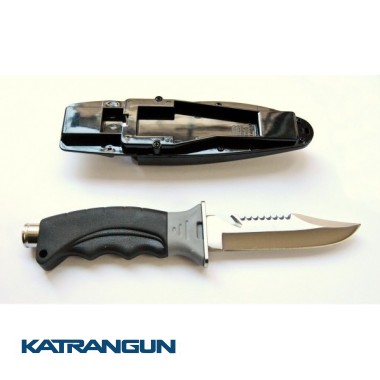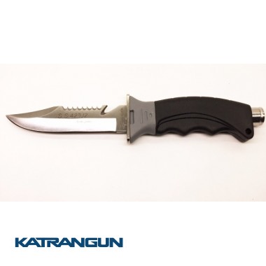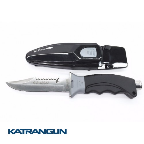 BS Diver Jamaica – универсальный компактный нож, который пригодится и подводным охотникам и дайверам. Он имеет укороченное лезвие длиной 11 см с двумя режущими кромками – прямой и серрейторной. Лезвие выполнено из высококачественной стали S.S. 420 J2, устойчивое к коррозии, долго держит заточку. Рукоятка ножа эргономичной формы, удобно ложится в любую перчатку, не скользит. В задней части рукоятки расположен небольшой молоточек для подачи сигналов под водой или забивания чего-либо. Ножны имеют специальную защелку-фиксатор, которая хорошо удерживает нож и не позволяет ему выскользнуть. Крепятся они к руке или ноге с помощью двух прочных ремешков, которые идут в комплекте.
