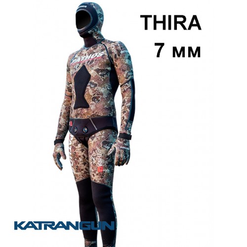 Гидрокостюм Pathos Thira изготовлен из супер эластичного неопрена Sheico высокой плотности, с идеальным камуфляжным рисунком для того, чтобы быть максимум не заметным под водой и на дне. Гидрокостюм разработан для обеспечения максимального комфорта, тепла и долговечности. Для этого предусмотрены неопреновые вставки, покрытые суперэластичной черной подкладкой с обеих сторон грудной клетки, непосредственно под подмышками и на передней части шеи, от основания до подбородка. Это позволяет легко дышать и облегчает движения шеи, где обычно складывается неопрен. Все швы покрыты неопреновым герметиком, который имеет двойное преимущество: обеспечивает герметизацию шва, избегая обычной усадки и повышая защиту от воды. Также на запястьях и лодыжках, на контуре лица имеется обтюрация для минимизации попадания воды. Более тонкий материал и отсутствие швов создают ощущение комфорта и гарантируют водонепроницаемость.
