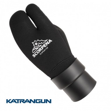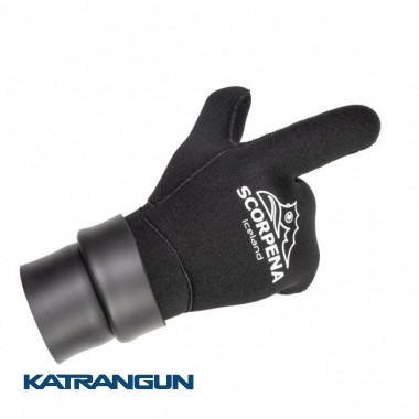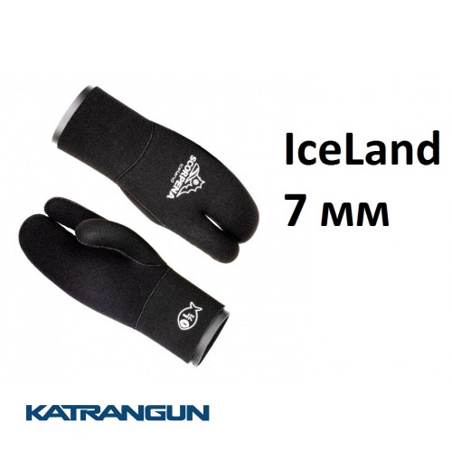 Iceland - трипалі рукавиці з подвійною манжетою, призначені для плавання в дуже холодній воді при підводному полюванні, дайвінг, фрідайвінг і заняттями іншими видами водного спорту спільно з неопреновими гідрокостюмами. Розташування в рукавиці разом трьох пальців руки істотно скорочує тепловтрати в порівнянні з пятипалой рукавичкою, а це значно збільшує тепловий комфорт і, як наслідок, час перебування під водою. Форма рукавиць SCORPENA Iceland створювалася з урахуванням анатомічних особливостей будови правої і лівої рук, а також враховує найбільш природне напівзігнуте положення кисті руки в розслабленому стані. Це зменшує навантаження на м'язи і також продовжує час комфортного плавання. Рукавиці Iceland виготовлені з м'якого і еластичного неопрена фірми SHEICO, склеєні новітнім неопреновим клеєм на водній основі (без хімічного розчинника). Потім тканину зшита «сліпим» швом (голка не пробиває неопрен наскрізь, а тільки зшиває зовнішню тканину), що перешкоджає проникненню води через шви. Долоню і пальці покрита стійким до стирання і порізів матеріалом типу supratex, що дозволяє не бояться випадкових ушкоджень при щоденній експлуатації. Тильна сторона долоні покрита міцним нейлоном. Ці рукавиці оснащені подвійною манжетою з внутрішнім покриттям типу smoothskin для використання з манжетами рукавів гідрокостюма з «відкритою порою» або гладким покриттям зсередини. Нижня манжета заправляється під рукав, верхня манжета розташовується зверху рукава. В результаті такого поєднання покриттів рукавиці і костюма на їх стику утворюється гідрозамок лабіринтового типу, і потрапляння води всередину через таке ущільнення практично виключається. Максимальний ізолюючий ефект досягається при використанні гідрокостюмів, оснащених подвійними манжетами на рукавах. Але потрібно пам'ятати, що для правильного надягання рукавиць такого типу бажана допомога напарника, особливо в перший час.