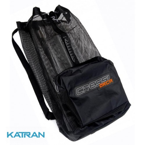 Сумка для плавання Cressi Sub Orca - легкий сітчастий чохол в якому зручно переносити ласти і маску. Має затягується шнурок у верхній частині сумки, на який вона закривається. На передній частині розташована кишеня із застібкою на блискавці в формі прямокутника в який можна покласти документи або дрібну екіпіровку для плавання. Вище є ручка для транспортування, а на задній частині - ремінець для плеча, який можна легко відрегулювати на свій розсуд.